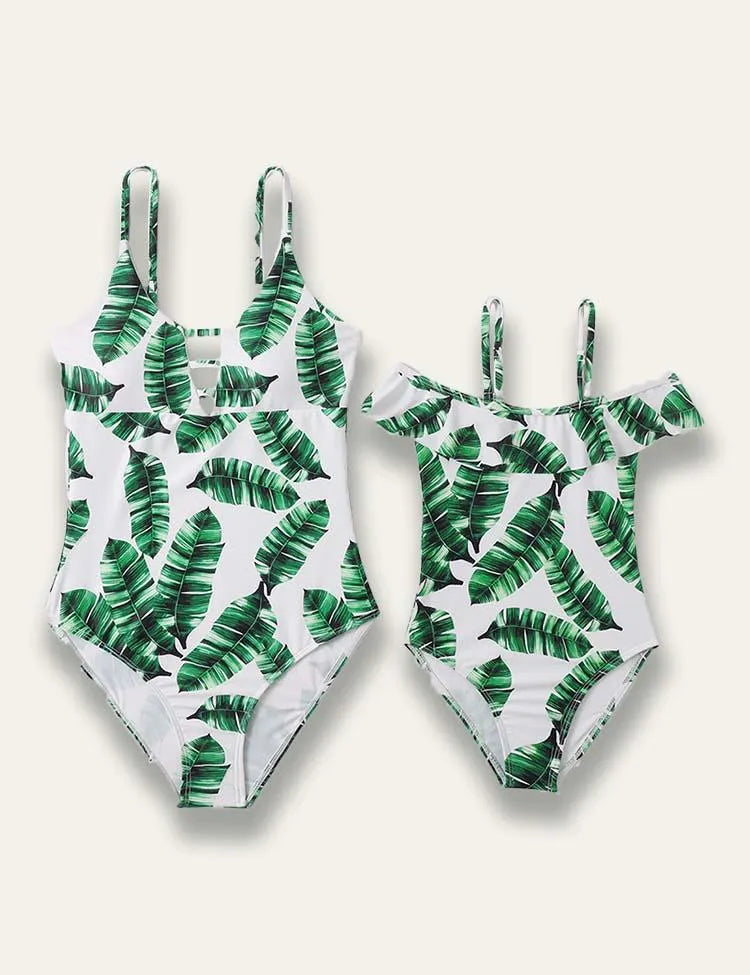 بدلة سباحة متطابقة للعائلة مطبوعة بأوراق الشجر