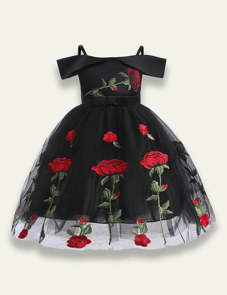 Off Shoulder Rose Embroidered Mesh Party Dress