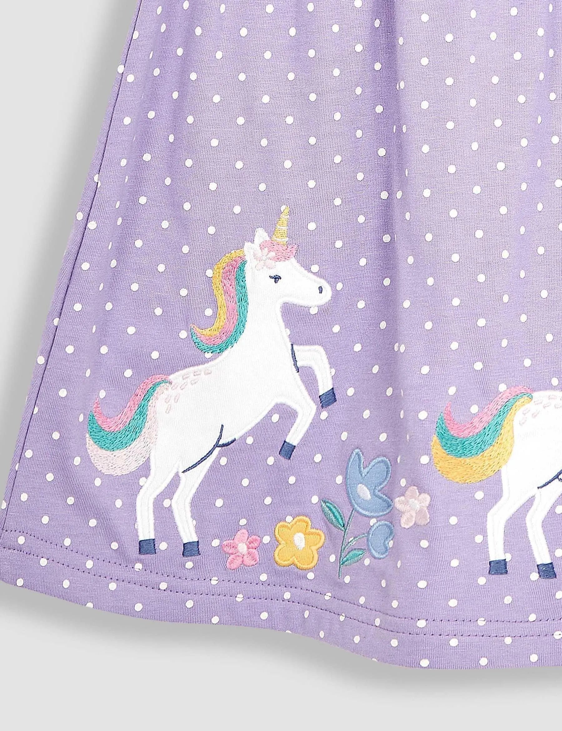 When polka dots alone just won’t do, this whimsical lilac purple jersey dress features appliqué unicorns and colourful flowers for a playful summer look. The frilly shoulders add a special element for everyday and occasion wear, while the super soft cotton fabric keeps things super comfy.