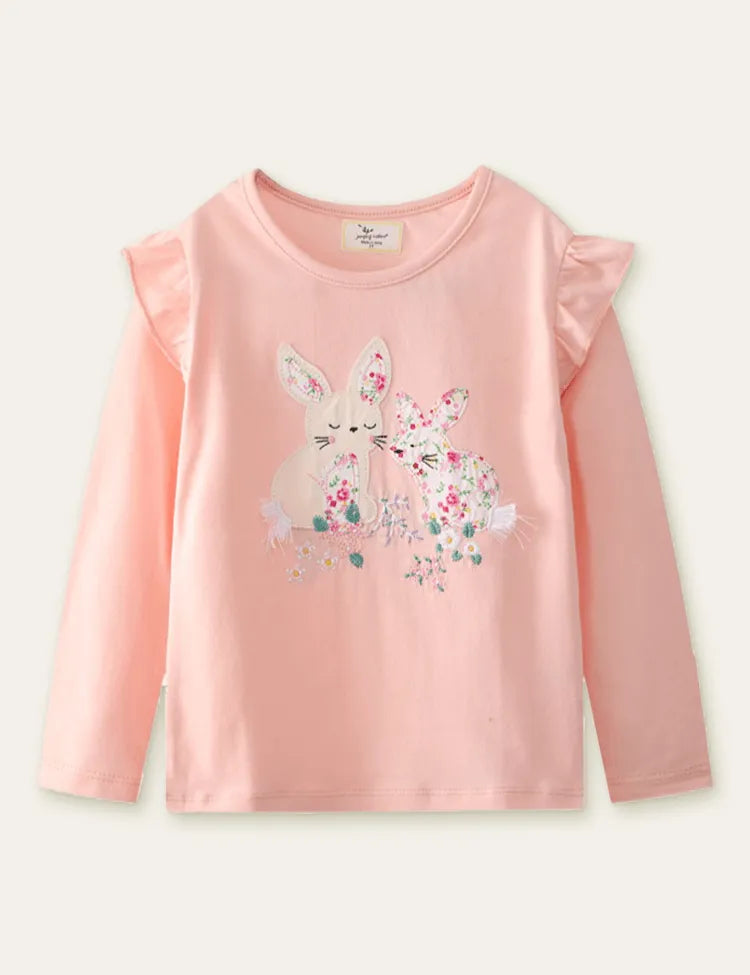 Floral Rabbit Appliqué Embroidered Long Sleeve T-shirt