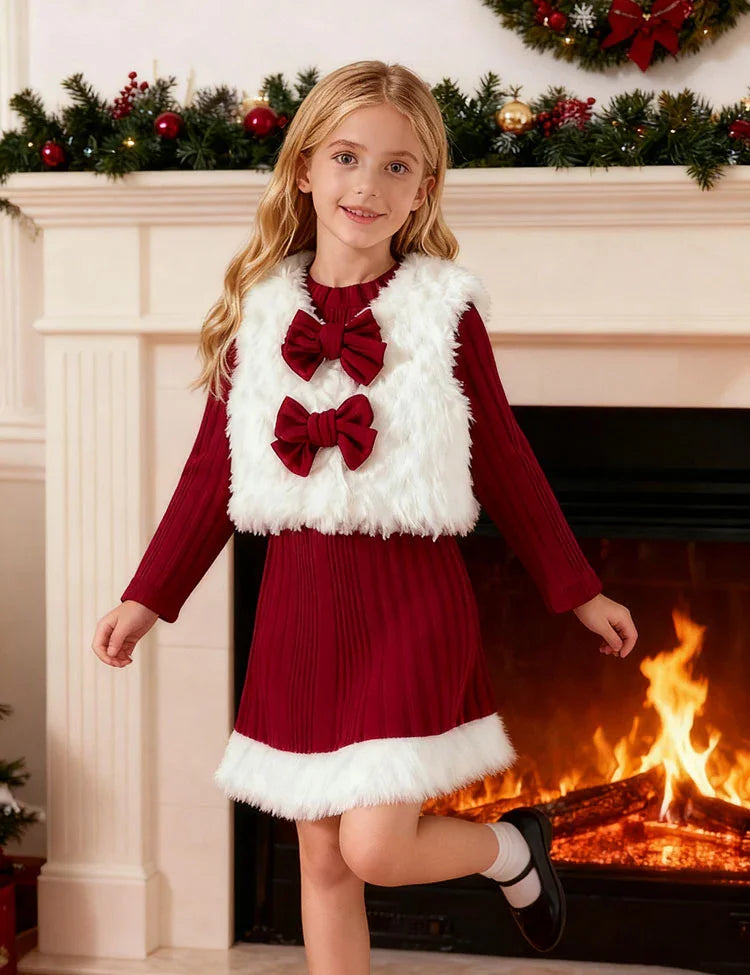 Christmas Knitted Dress With Plush Vest Set